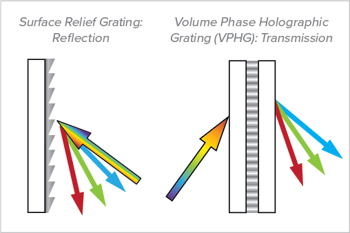 相比之下,体积相位光栅可以比标准的表面浮雕光栅更厚,并且它们没有开放的凹槽。它们的工作原理是基于介质中折射率的变化(即指数调制),通过调整介质的厚度和折射率调制,使其能够在不同的波长下工作。体相光栅通常被用作透射光栅。