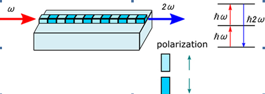 如图所示,准相位匹配是通过改变光路传播方向上每半个相干长度上的偏振方向来实现的,不同的结构以及改变方式产生了不同的波长转换效果。