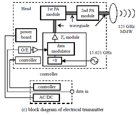 其次,该系统进行了10 Gbps,300 m~800 m 的传输实验,成为国际太赫兹通信的标志性成果。随着InP HEMT TMIC 技术的发展,NTT 公司研究了全电子学0.12 THz 发射机代替了原来的光电变换发射机,如上图(c)所示,15.625 GHz信号经8 倍频至0.125 THz,而输入的光信号数据经光-电转换为电信号数据后对0.125 THz 载波进行ASK 调制,然后经过二级放大器放大后(40 mW)输出至天线。接收端仍然采用肖特基二极管检测技术来实现。上图(d):表格列出了光电结合和全电子2 种技术的比较,显然全电子技术具有明显的优势。