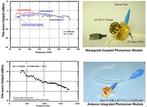 UTC-PD(Uni-Traveling-Carrier Photodiode,单行载流子光电二极管)是NTT公司推出的太赫兹混频器,采用行业应用最优的技术产生太赫兹辐射,两束波长不同的激光拍频到UTC-PD中,形成频率在75GHz-2.5THz范围内的太赫兹辐射。其结构特点是由p型中性光吸收层和n型宽带隙集结层构成,并且只用电子作为有源载流子。由于电子漂移速度远高于空穴,因此需要更强的入射激光激发产生更大量的电子才能引起电子的囤积,所以与PIN-PD相比,UTC-PD有效地抑制了空间电荷效应,使得输出信号下降沿更为迅速,这就极大程度上提升了探测器的响应速度。NTT公司共有两种UTC-PD光混频模块可供选择:波导耦合式,适用于THz通讯;集成天线式,适用于THz光谱及成像。